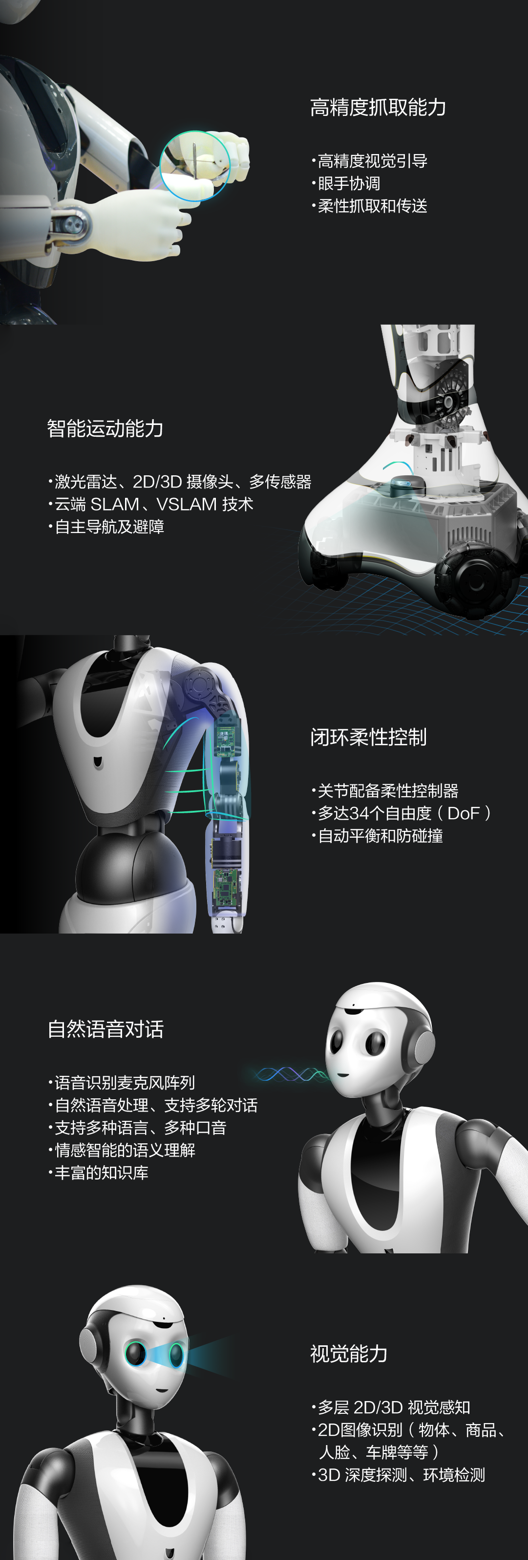精准的视觉抓取能力、全方位的听、说、看、动等融合智能能力。